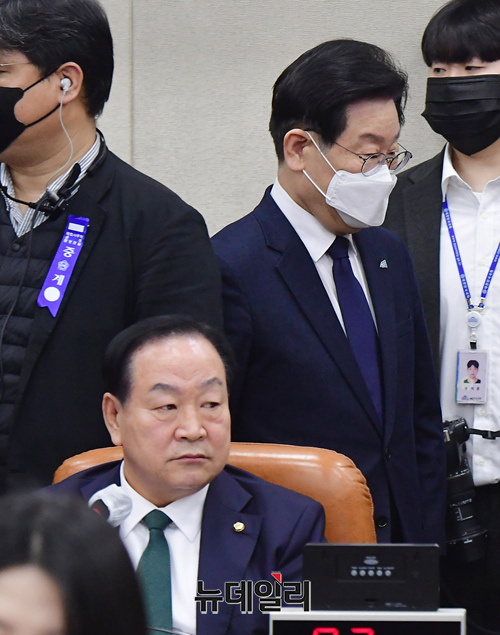 이재명 더불어민주당 대표가 26일 국회에서 열린 국방위원회 전체회의 중 회의장을 떠나고 있다.