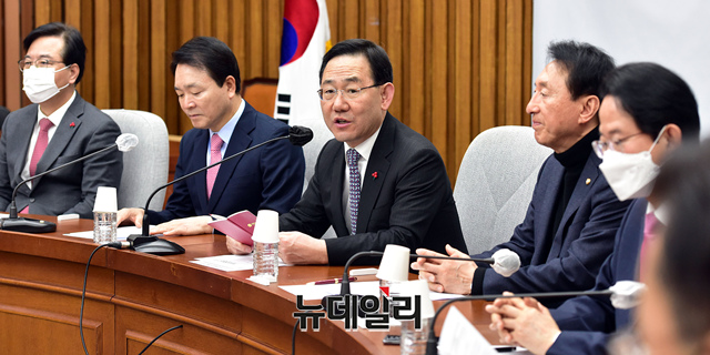 주호영 국민의힘 원내대표가 27일 오전 국회에서 열린 원내대책회의에서 모두발언을 하고 있다.