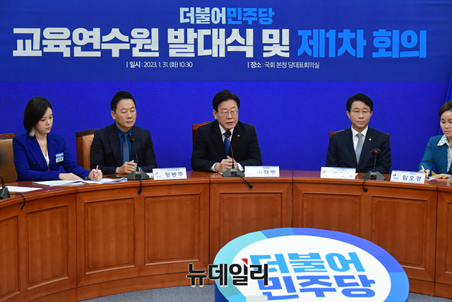이재명 더불어민주당 대표가 31일 오전 국회에서 열린 교육연수원 발대식 및 제1차 회의에서 모두발언을 하고 있다.