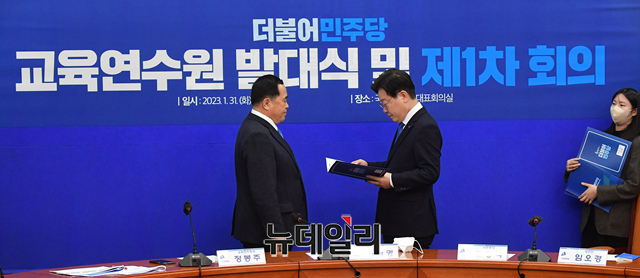 이재명 더불어민주당 대표가 31일 오전 국회에서 열린 교육연수원 발대식 및 제1차 회의에서 부원장들에게 임명장을 전달하고 있다.
