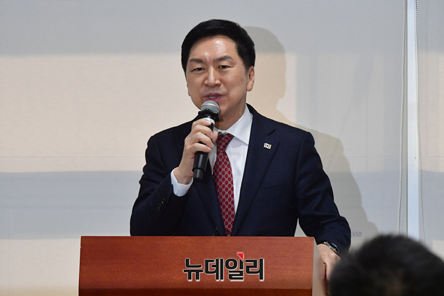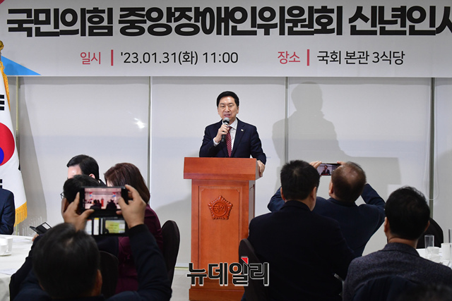 당권에 도전한 김기현 국민의힘 의원이 31일 오전 국회에서 열린 국민의힘 중앙장애인위원회 신년인사회에 참석해 축사를 하고 있다.