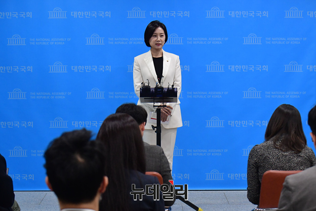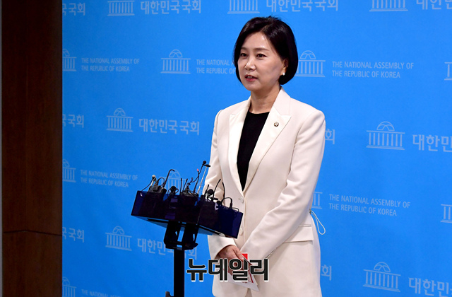 허은아 국민의힘 의원이 3일 오전 국회 소통관에서 열린 최고위원 출마선언 기자회견을 마치고 기자들의 질문에 답하고 있다.