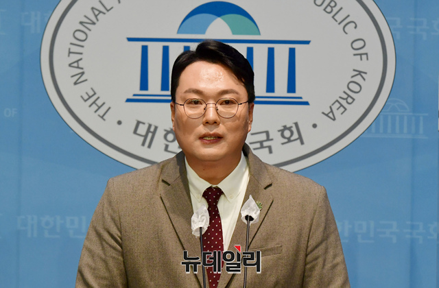 국민의힘 전남 순천갑 당협위원장인 천하람 변호사가 3일 오전 국회 소통관에서 국민의힘 당대표 출마선언을 하고 있다.