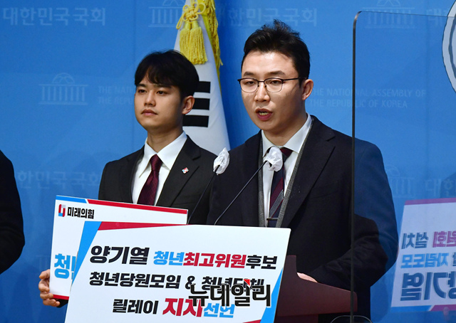 양기열 국민의힘 청년최고위원 후보가 3일 오전 국회 소통관에서 청년당원 모임·청년단체 지지자들과 기자회견을 하고 있다.