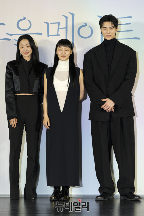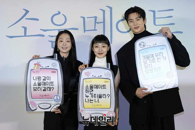 배우 김다미, 전소니, 변우석이 3일 오전 서울 광진구 롯데시네마 건대입구점에서 열린 영화 '소울메이트(감독 민용근)' 제작보고회에서 단체사진을 찍고 있다.