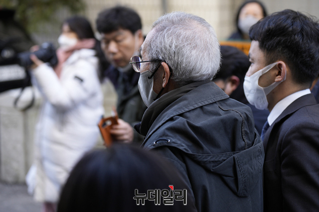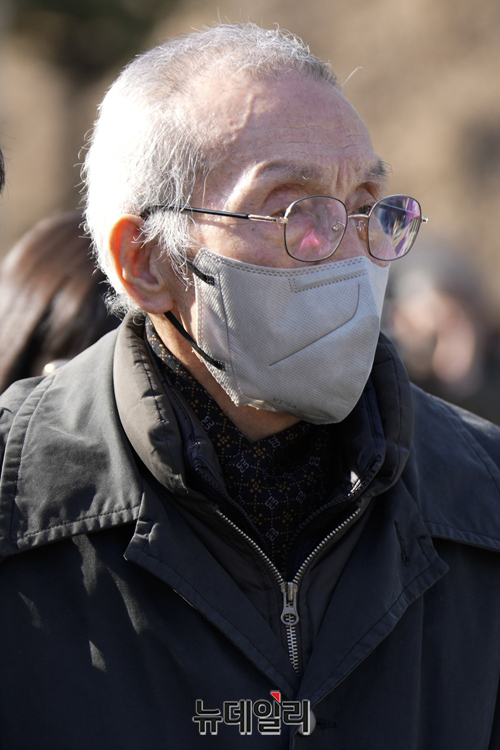 강제추행 혐의를 받고 있는 배우 오영수가 3일 오후 경기 성남시 수원지방법원 성남지원에서 진행된 첫 공판을 마치고 법원을 나서고 있다.