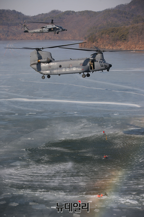 우리공군 제6탐색구조비행전대가 3일 오후 충북 진천군 초평저수지에서 '공군 혹한기 수상·수중 구조작전 훈련'을 진행했다. 이날 6전대는 HH-60, HH-47, HH-32 헬기로 탐색구조훈련을 진행했다. (사진=공동취재단)
