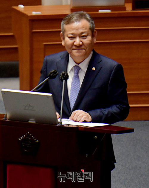 이상민 행정안전부 장관이 6일 오후 국회 본회의장에서 열린 정치·외교·통일·안보 분야 대정부 질문에서 답변을 하고 있다.