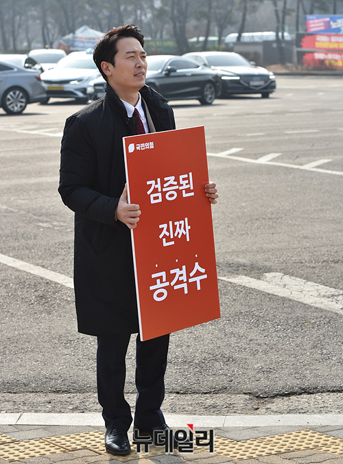이기인 국민의힘 청년최고위원 후보가 6일 오전 국회 인근 도로에서 정견을 밝히는 피켓팅을 하고 있다.