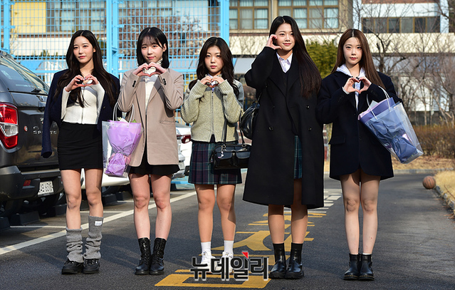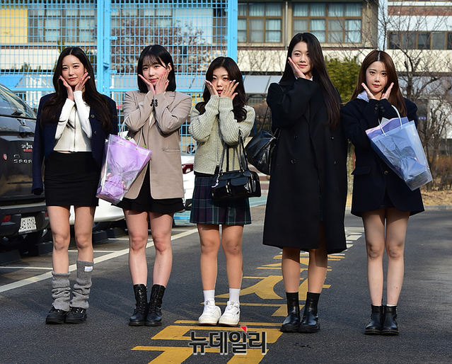 걸그룹 클라씨가 7일 오전 서울 강남구 언주중학교에서 멤버 지민과 리원의 졸업식에 참석해 포즈를 취하고 있다.