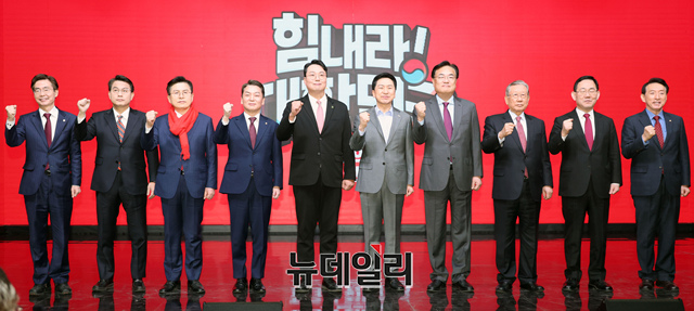 국민의힘 제3차 전당대회 후보자 비전 발표회가 7일 서울 강서구 한 방송 스튜디오에서 열린 가운데 정진석 비대위원장, 주호영 원내대표 등 당지도부와 김기현·안철수·윤상현·조경태·천하람·황교안 대표 후보들이 기념촬영을 하고 있다. (공동취재사진)