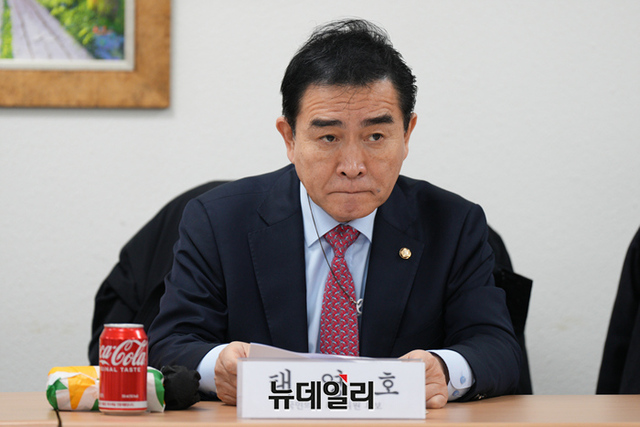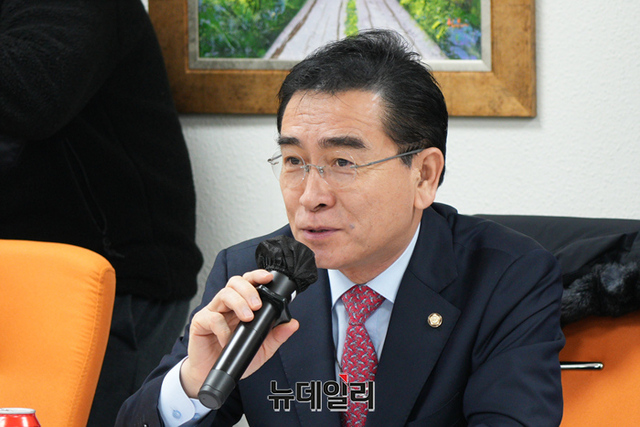 태영호 국민의힘 최고위원 후보가 8일 오전 서울 여의도 자유기업원에서 시민사회 초청으로 열린 연석회의에서 발언하고 있다.