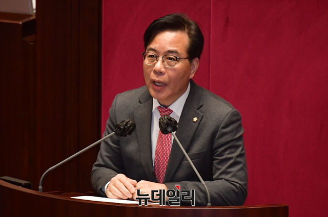 진성준 더불어민주당 의원이 8일 오후 국회에서 열린 본회의에서 이상민 행정안전부 장관에 대한 탄핵소추안의 법사위원회로의 회부 동의의 건에 대한 송언석 국민의힘 의원의 제안설명이 길어지자 김진표 국회의장에게 항의하고 있다.