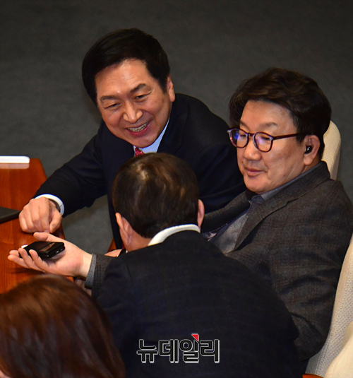 김기현 국민의힘 당대표 후보가 8일 오후 국회에서 열린 본회의에서 권성동 의원과 대화를 나누고 있다.