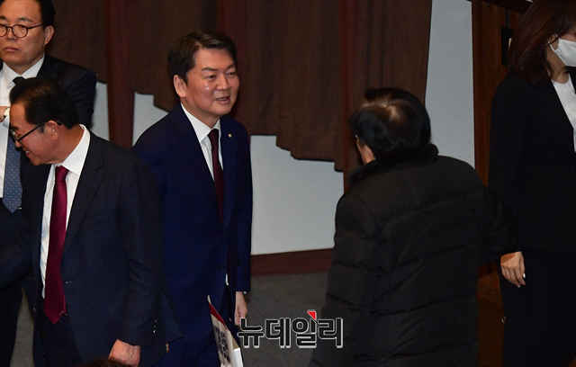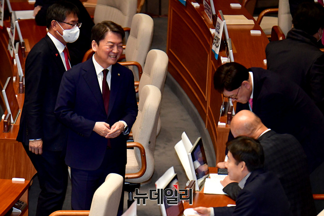 안철수 국민의힘 당대표 후보가 8일 오후 국회에서 열린 본회의에서 동료 의원들과 인사를 하고 있다.