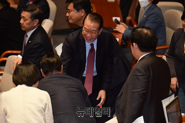 박진 외교부 장관과 권영세 통일부 장관이 8일 오후 국회에서 열린 본회의에서 의원들과 인사를 하고 있다.