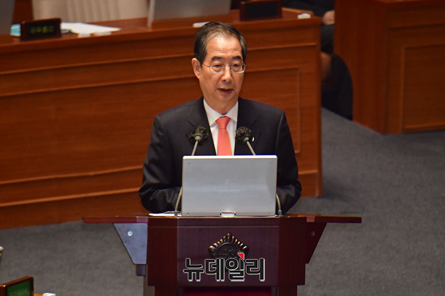 한덕수 국무총리가 8일 오후 국회 본회의에서 열린 교육·사회·문화에 대한 대정부 질문에서 답하고 있다.
