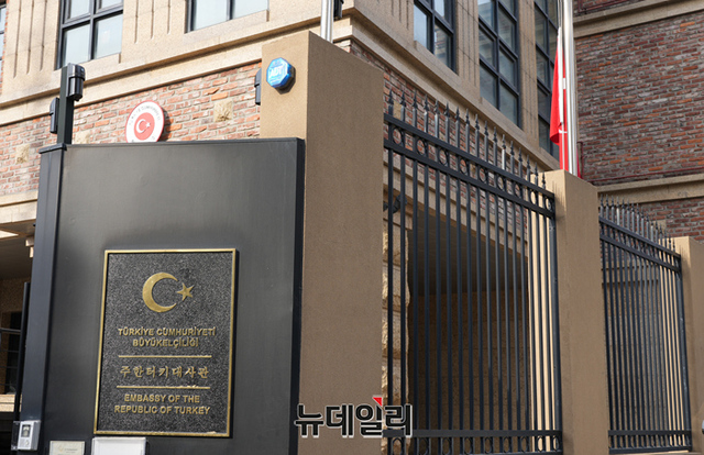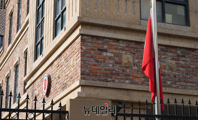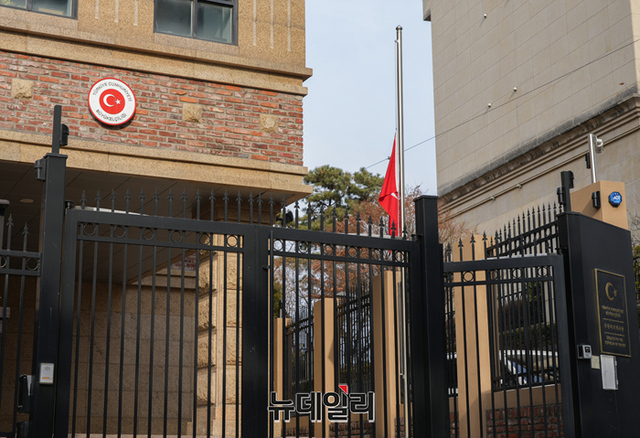 튀르키예 가지안테프에서 발생한 대규모 지진으로 많은 사상자가 발생하고 있는 9일 오후 서울 중구 주한 튀르키예 대사관에 조기가 내걸려 있다.