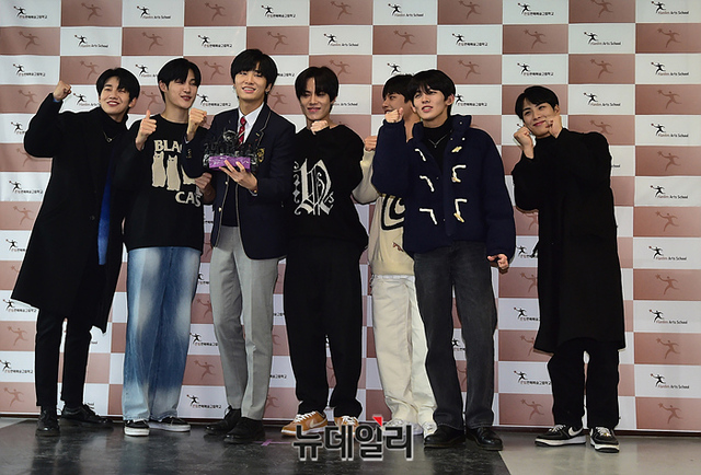 아이돌그룹 TAN 지석이 9일 오전 서울 송파구 한림연예예술고에서 열린 졸업식에 멤버들과 참석해 포즈를 취하고 있다.
