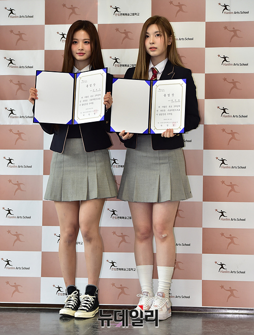 엔믹스 설윤, 배이가 9일 오전 서울 송파구 한림연예예술고등학교에서 열린 졸업식에 참석해 포즈를 취하고 있다.