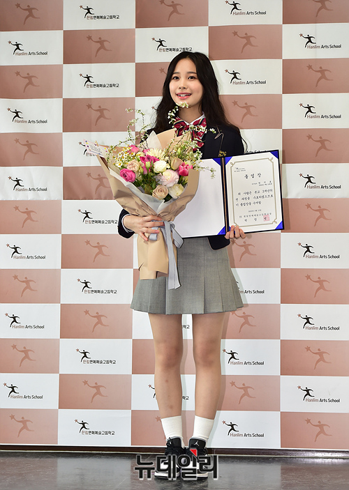 위클리 지한이 9일 오전 서울 송파구 한림연예예술고에서 열린 졸업식에 참석해 포즈를 취하고 있다.