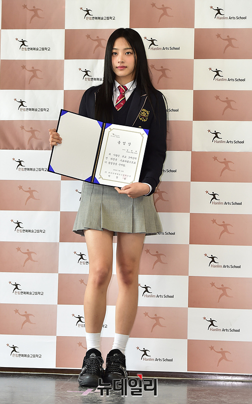 뉴진스 민지가 9일 오전 서울 송파구 한림연예예술고에서 열린 졸업식에 참석해 포즈를 취하고 있다.