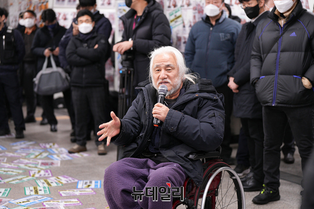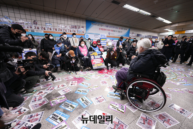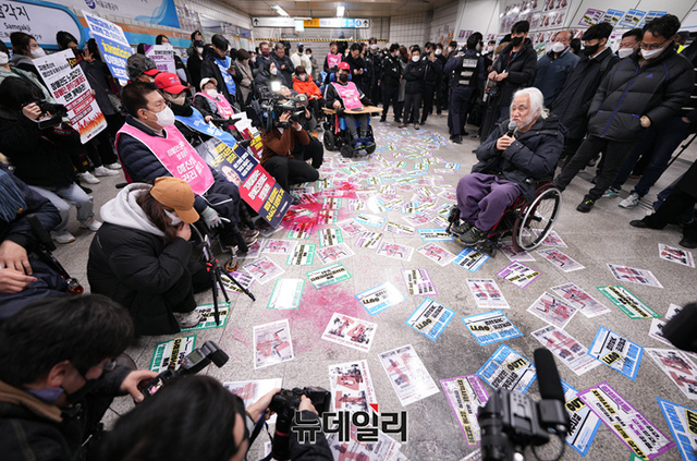 박경석 전국장애인차별철폐연대(전장연) 대표가 13일 오전 서울 지하철4호선 삼각지역에서 열린 기자회견에서 발언하고 있다. 전장연측은 3월 23일까지 지하철탑승시위를 중단한다고 밝혔다.