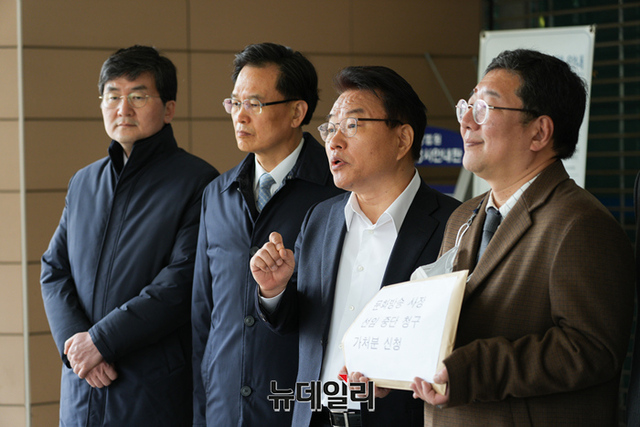 김도인 방송문화진흥회 이사가 13일 오전 서울 마포구 서부지방법원에서 열린 'MBC 대표이사 선임절차 중지 가처분 신청' 기자회견에서 발언하고 있다.