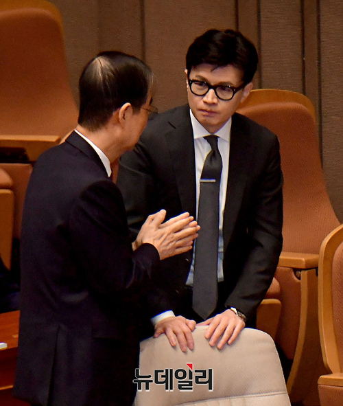 한덕수 국무총리가 13일 오전 국회에서 열린 본회의에 참석해 한동훈 법무부장관과 대화를 나누고 있다.