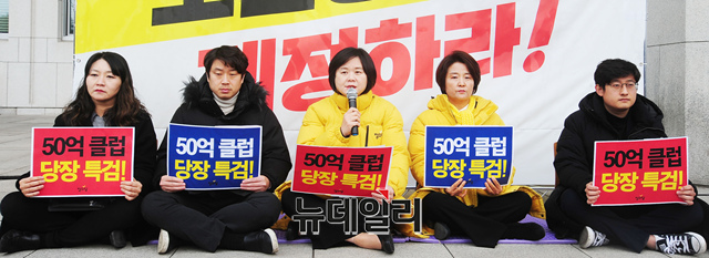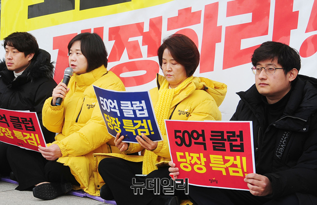 이정미 정의당 대표가 13일 국회 본청 앞 농성장에서 열린 상무집행위원회의에서 모두발언을 하고 있다.