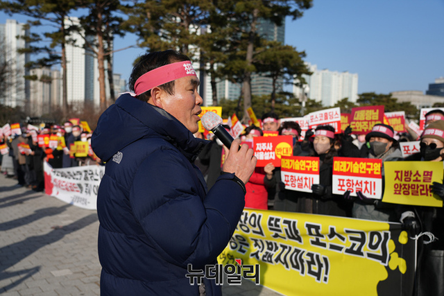 포스코범시민대책위원회가 14일 오전 서울 용산구 대통령실 앞에서 상경집회를 갖고 '업무상 배임 사건 수사' '포스코홀딩스 최정우 회장 퇴진' '미래기술연구원 설치' 등을 촉구했다.