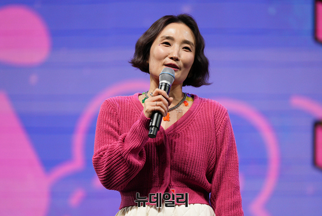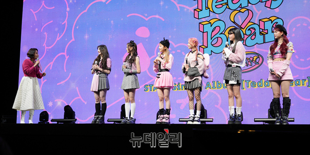 방송인 박경림이 14일 오후 서울 광진구 예스24라이브홀에서 열린 스테이씨(STAYC) 싱글 앨범 'Teddy Bear' 발매 기념 쇼케이스에서 스테이씨를 소개하고 있다.