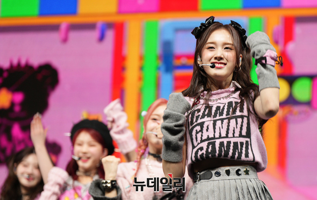 걸그룹 스테이씨(STAYC)가 14일 오후 서울 광진구 예스24라이브홀에서 열린 싱글 앨범 'Teddy Bear' 발매 기념 쇼케이스에서 타이틀곡 무대를 선보이고 있다.