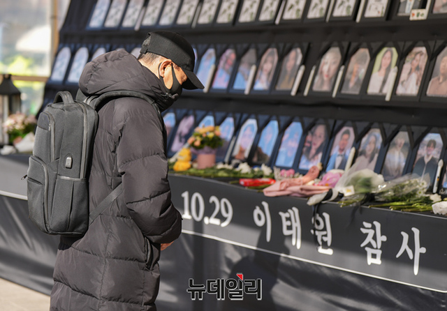 서울광장에 마련된 이태원 합동분향소를 찾은 시민들이 15일 오전 헌화하고 있다. 서울시는 합동분향소를 15일 오후 1시 까지 자진 철거 기한으로 제시한 상태다.