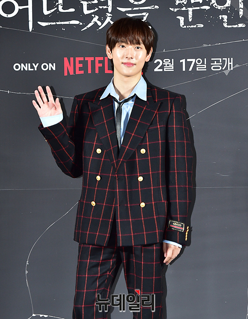 배우 임시완이 15일 오전 서울 광진구 롯데시네마 건대입구에서 열린 넷플릭스 '스마트폰을 떨어뜨렸을 뿐인데' 제작보고회에서 포즈를 취하고 있다.