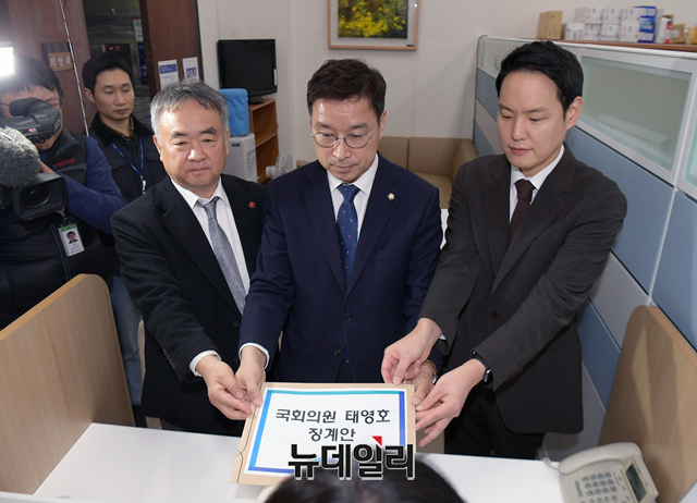 위성곤 더불어민주당 원내수석부대표와 송재호, 김한규 의원이 15일 오전 국회 의안과에 태영호 국민의힘 의원 징계안을 제출하고 있다.