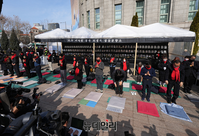 [포토] 서울광장 합동분향소서 159배 하는 이태원참사 유가족들