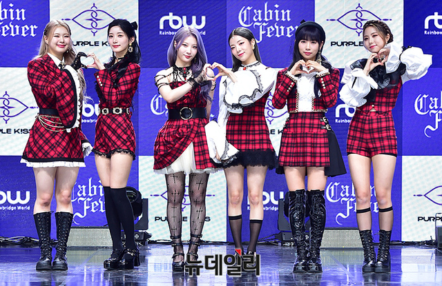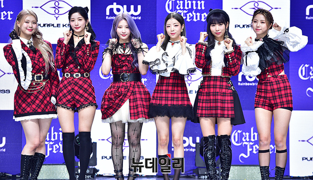 걸그룹 퍼플키스가 15일 오후 서울 광진구 건국대학교 새천년기념관에서 열린 미니 5집 'Cabin Fever' 발매 기념 미디어 쇼케이스에서 포즈를 취하고 있다.