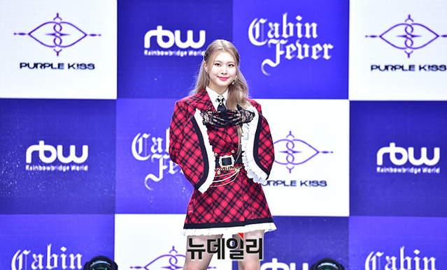 퍼플키스 수안이 15일 오후 서울 광진구 건국대학교 새천년기념관에서 열린 미니 5집 'Cabin Fever' 발매 기념 미디어 쇼케이스에서 포즈를 취하고 있다.