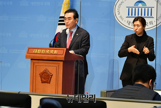 태영호 국민의힘 의원이 15일 오후 국회 소통관에서 제주 4.3사건 관련 기자회견을 하고 있다.