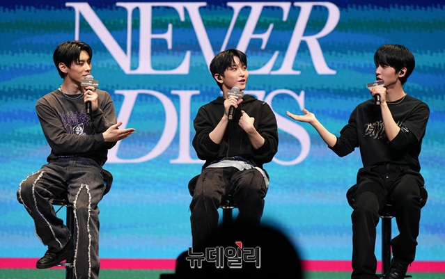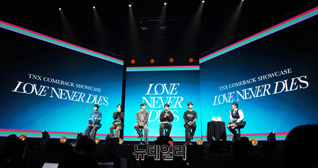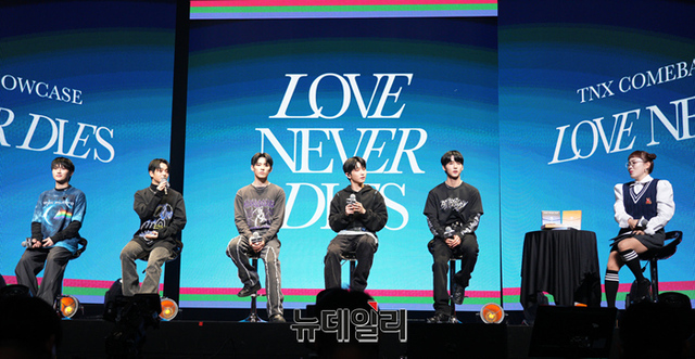 아이돌그룹 TNX(티엔엑스)가 15일 오후 서울 용산구 블루스퀘어에서 열린 두번째 미니앨범 'Love Never Dies' 쇼케이스에서 질의응답 시간을 갖고있다.