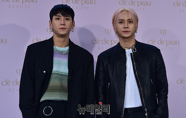 댄서 권트윈스가 15일 오후 서울 성동구 무신사 테라스에서 열린 끌레드뽀 보떼 신제품 런칭 행사에서 포즈를 취하고 있다. 팝업은 19일까지 오픈.