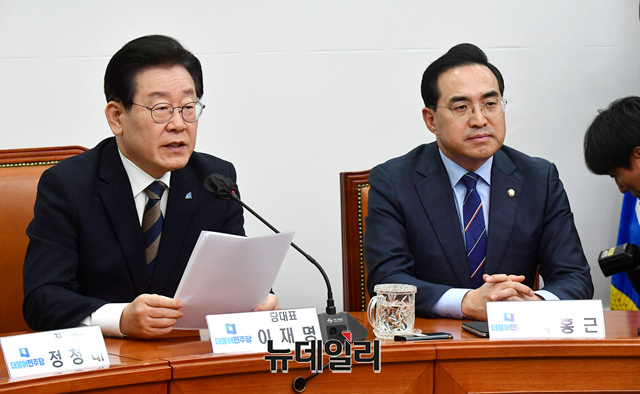이재명 더불어민주당 대표가 16일 오후 국회에서 열린 긴급 최고위원회의에서 검찰의 구속영장 청구에 대한 입장을 밝히고 있다.