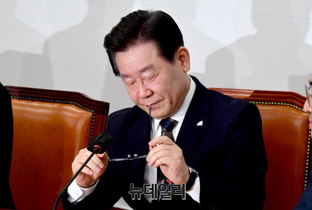 이재명 더불어민주당 대표가 16일 오후 국회에서 열린 긴급 최고위원회의에서 안경을 고쳐 쓰고 있다.