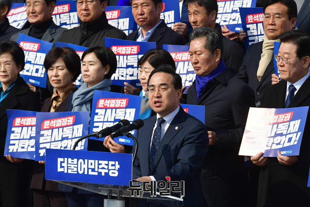 박홍근 더불어민주당 원내대표가 17일 오전 국회 본청 계단에서 열린 윤석열 정권 검사독재 규탄대회에서 발언을 하고 있다.