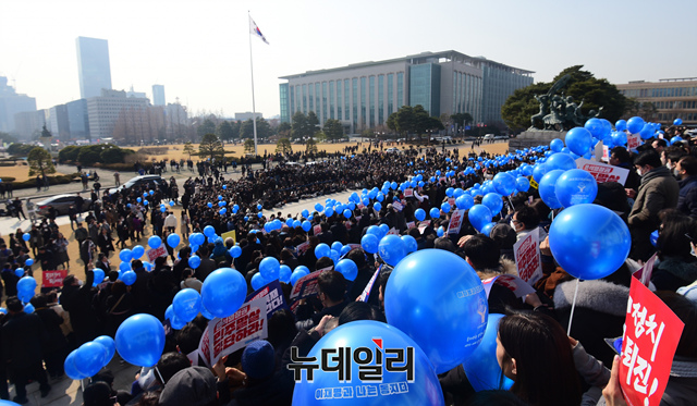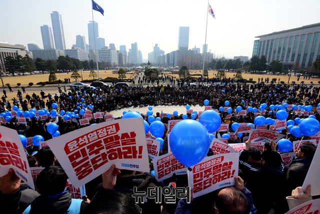 더불어민주당 주최 윤석열 정권 검사독재 규탄대회가 17일 오전 국회 본청 계단에서 열린 가운데 이재명 대표 지지자들이 파란 풍선을 흔들며 구호를 외치고 있다.