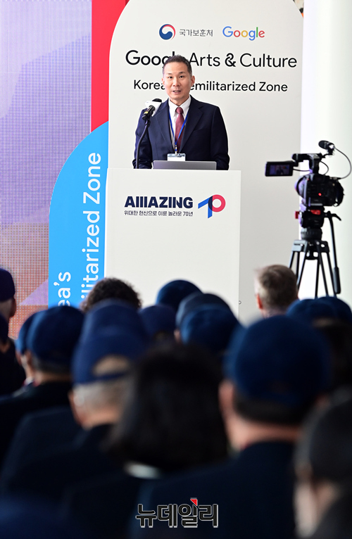 김경훈 구글코리아 사장이 22일 오전 서울 용산구 전쟁기념관에서 열린 '어메이징 70, 구글 아트 앤 컬처 DMZ 글로벌 론칭·헌정 행사'에서 인사말을 하고 있다.이번 행사는 구글이 6.25전쟁 정전 70주년을 맞아 국가보훈처가 추진하는 연간 기념 사업의 첫번째 협력 프로그램이다.비영리 온라인 전시 플랫폼인 구글 아트앤 컬처의 '한국의 비무장지대' 온라인 전시다. 전시는 구글 아트 앤 컬처 사이트(goo.gle/koreadmz)를 방문하거나 공식앱을 통해 누구나 감상할 수 있다.