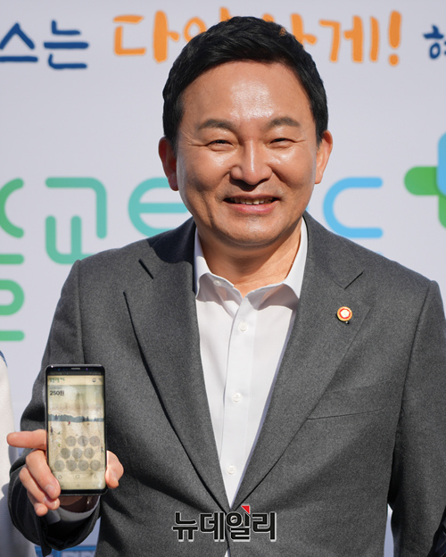 원희룡 국토교통부 장관이 22일 오전 서울 종로구 포스트타워에서 열린 알뜰교통카드 플러스 협약식 직후 시민들과 기념촬영을 하고 있다.