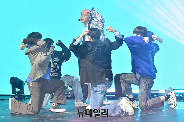 7인조 신인 보이그룹 '하우'가 23일 오후 서울 강남구 슈피겐홀에서 열린 첫번째 미니앨범 'HOW R U' 발매 쇼케이스에서 수록곡 'Wanna Be Love' 무대를 선보이고 있다.