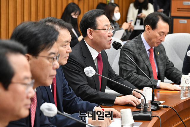 주호영 국민의힘 원내대표가 24일 오전 국회에서 열린 원내대책회의에서 모두발언을 하고 있다.
